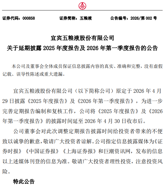 五粮液4月28日公告,公司原定于2026年4月29日披露《2025年度报告》及《2026年第一季度报告》,为进一步完善定期报告编制和复核工作,公司将《2025年度报告》及《2026年第一季度报告》的披露时间延至2026年4月30日收市后。