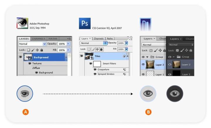 早期PS的眼睛图标做得跟解剖图似的,棕色眼球,黑色瞳孔,连眼白的高光都画出来了,睫毛根根分明。