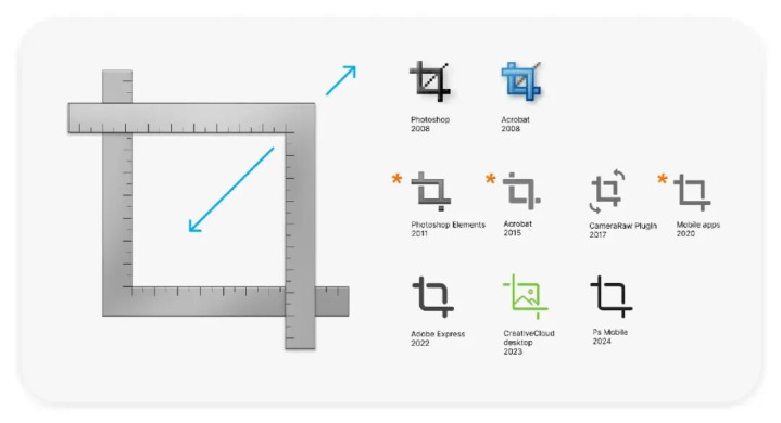 后来数字设计普及,用PS的不一定是专业摄影师了,设计师加了个旋转箭头,告诉你“这玩意儿还能转着裁”,2020年又悄悄调整了标尺交叉位置,把左上角和右下角的标尺线做得更明显,方便用户对齐。