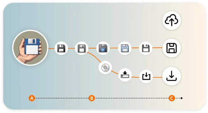 后来电脑不用软盘了,光盘、U盘、云端轮番上阵,这图标却没跟着换。
