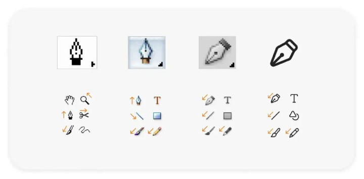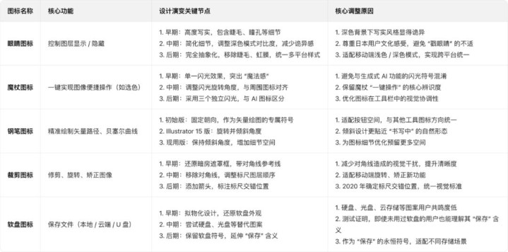 软盘图标告诉你“好设计能让淘汰品活成符号”,眼睛图标证明“有时候简单比复杂更有力量”,魔棒工具展示“技术扎堆时,辨识度比好看更重要”,裁剪工具说明“守住核心功能的视觉符号,用户就不会迷路”,钢笔工具则演绎了“一个符号能成为整个行业的暗号”。